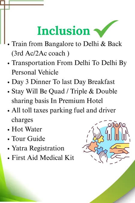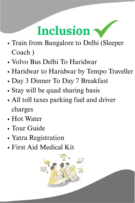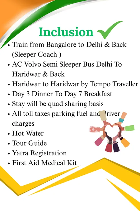 In this package, we create a group of 16 people and your travelling will be in 17 seater tempo traveller. We provide you train ticket in 3rd Ac from Bangalore to Haridwar, a luxury hotel and resort stay, freshly prepared meals, one guide for your group, Yatra registration, etc.