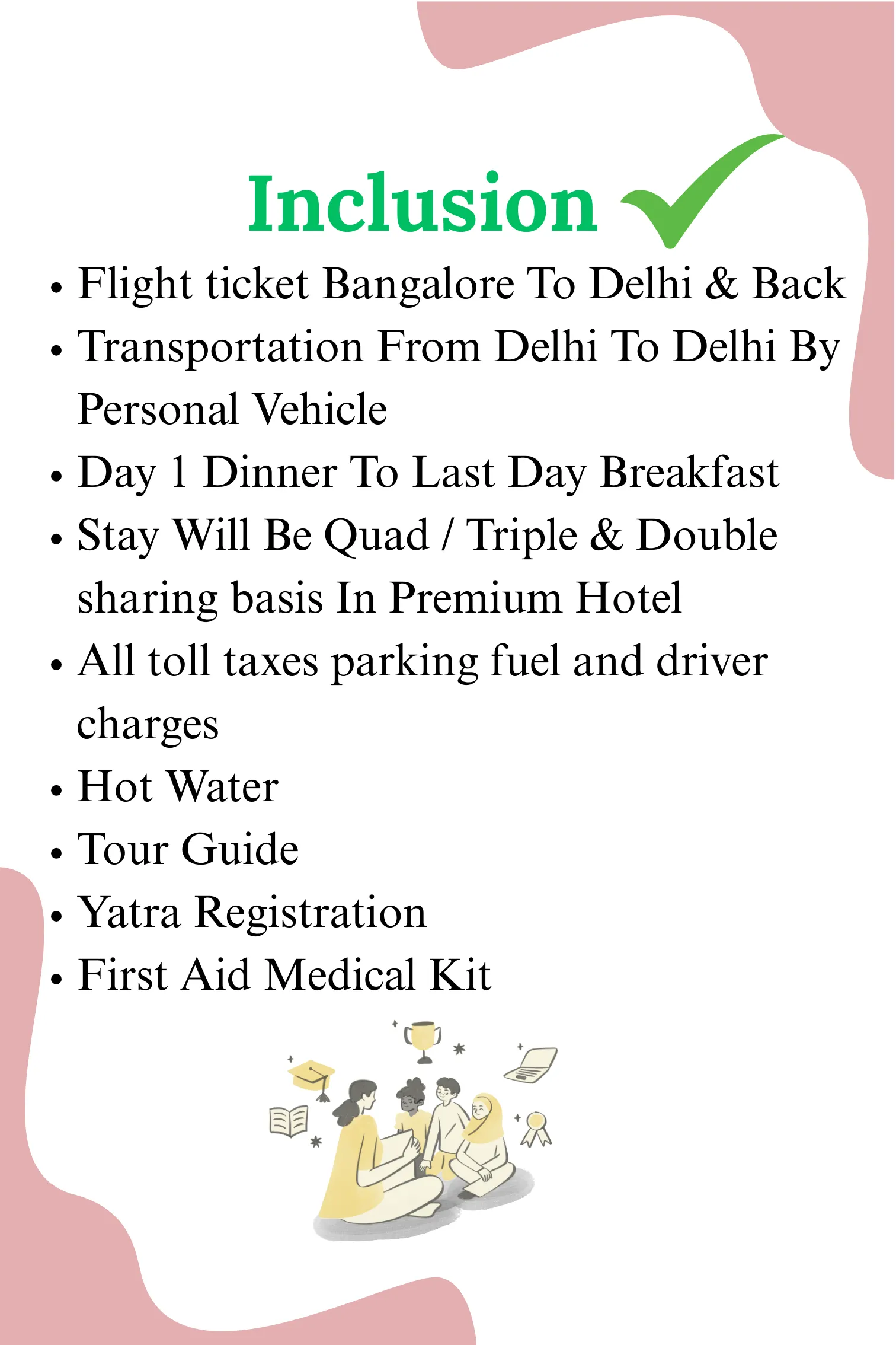 Although we have created all the above packages with utmost care. But we also admit that there may be some loopholes, as you are the best person who can tell us the exact requirements of your group. So we are open to minor or major customisation in our predefined package.